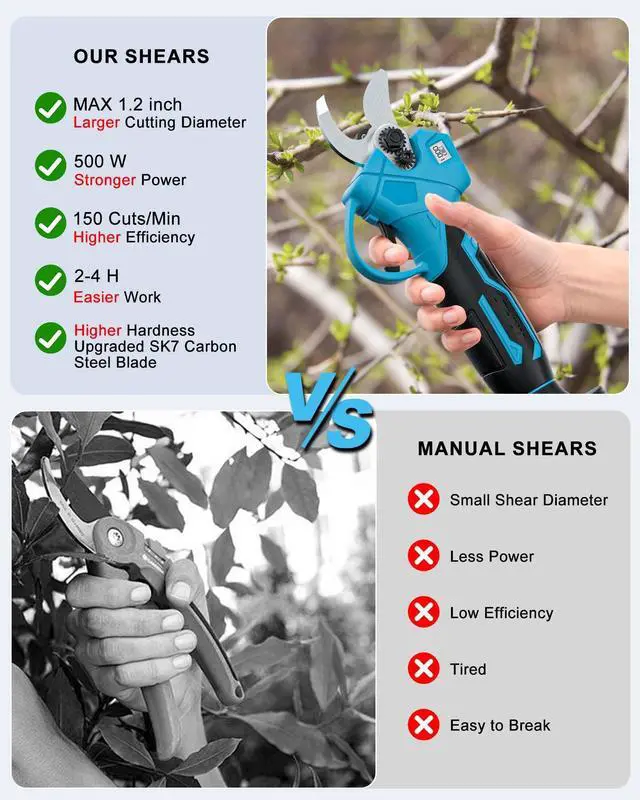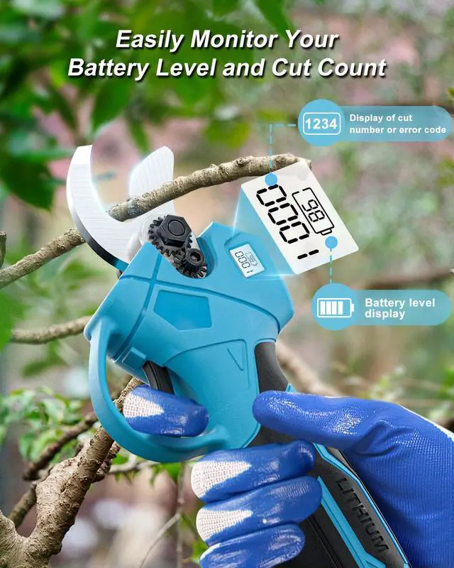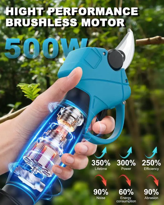 [Strong Power] Our electric branches cutter are equipped with a 500W brushless motor. Compared with pure copper motors, the life of the brushless motor increases by 350%, the power is increased by 300%, your efficiency is increased by 250%, the wear will be reduced by 90%, and the energy consumption will be reduced by 60%. Let you continue to pruning work continuously and efficiently.