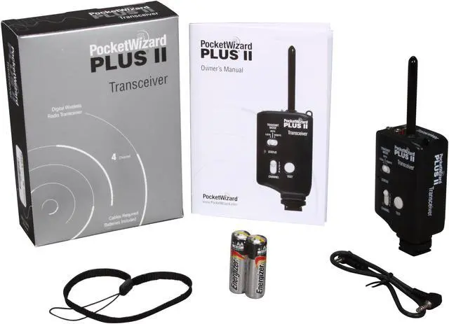 | Features | Fast ‘plug-and-play' set-up. Simply power up, choose a channel, connect your flash cable and you're good to go. Auto-Sensing Transceiver Technology enables the Plus II transceiver to switch back and forth between transmitter and receiver modes as needed for greater flexibility on the job. All PocketWizard transceivers default to receiver mode. When a hot-shoe or other trigger is detected, it automatically switches to transmitter mode. Auto-Sensing may be disabled if desired. Auto-Relay Mode allows photographers to remotely trigger their camera(s) and a camera-mounted Plus II transceiver relay the triggering signal to remote flashes and/or other remote cameras. A choice of four 16-bit, digitally coded channels enables you to simultaneously trigger all of your lights at once, or to isolate one group of lights from another for more complex setups. Multi-channel switching also helps to isolate your lights when shooting in close proximity to other photographers. Capable of triggering lights or cameras at a sustained rate of up to 12 fps; faster then the best DSLR today. Ultra-fast microprocessors enable trigger-response times as short as 1/2000th of a second allowing for reliable sync speeds of 1/250th for focal plane shutters and 1/500th for leaf shutters. Miniphone connector cables are available for all major brands of lighting equipment in lengths of up to 16'. Dedicated camera triggering cables are also available for all popular camera systems. Thoroughly compatible with earlier-version PocketWizard transmitters and receivers. Durable, compact design with an unobtrusive, rubberized antenna. The total height of the transceiver and antenna is less than 6.5", and it weighs in at 6oz including batteries. A sturdy lock-ring for hot shoes ensure a secure fit to your camera or bracket or use the ¼ 20 mount or lanyard. Power is supplied by 2 AA batteries, which are good for about 60 hours. An optional AC adapter allows for unlimited shoot time |