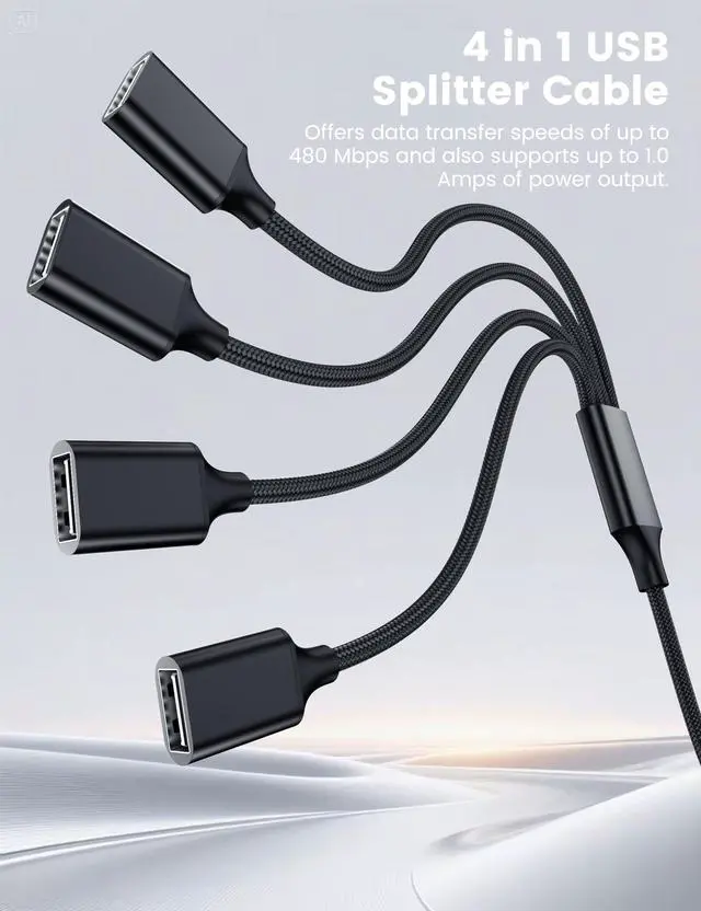 This usb extension cable can transform one USB ports into 4 USB ports so that you can easily connect your USB-A accessories to a device that does not have enough USB ports. The usb 2.0 splitter Offers data transfer speeds of up to 480 Mbps and also supports up to 1 Amps of power output. Note: It does not work for car USB/ Apple Carplay.