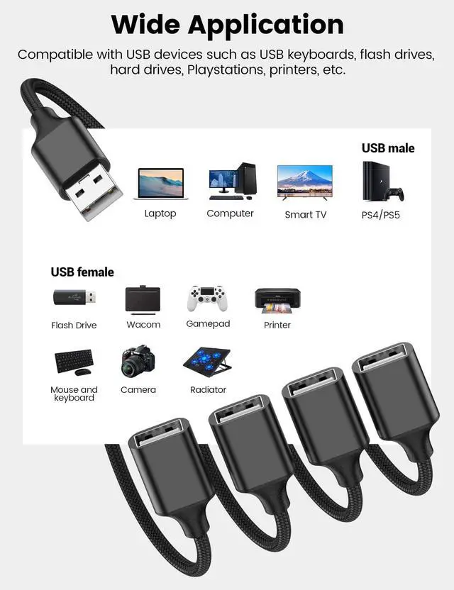 4 Way USB Splitter, 6.6FT USB Extension Cable, A Male to 4 Female Extension Cord for TV/PC/Laptop/MacBook/Keyboard/ PS4/ PS5/ Flash Drive/Laptop/LED Etc.