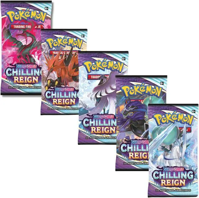 Seize the advantage with Pokmon of the frozen lands, with the powerful Ice Rider Calyrex VMAX and Shadow Rider Calyrex VMAX?plus the Galarian forms of Articuno, Zapdos, and Moltres! Phantom hauntings, howling blizzards, and wild battles?expand the realms of your Pokmon strategy with new powers and new possibilities. Press on despite ghostly opposition, and claim total victory in the land of spectral snow with the Pokmon TCG: Sword & Shield Chilling Reign expansion! Start your Pokmon journey with the Sword & Shield Chilling Reign 5-Pack Bundle today and watch your collection soar to new heights!