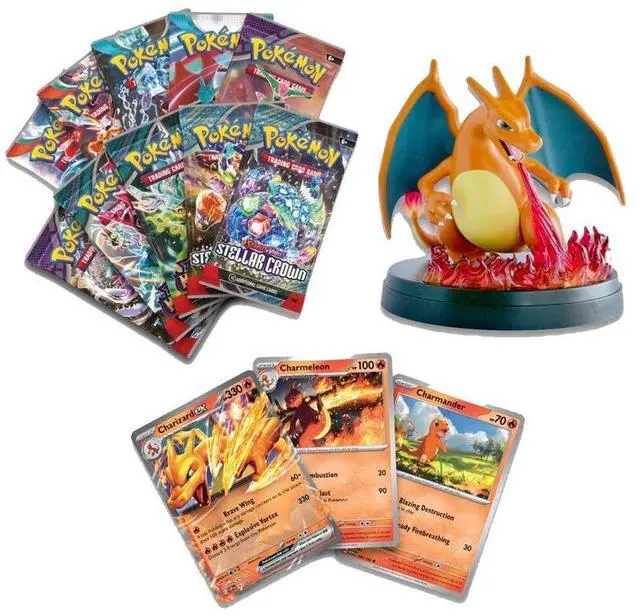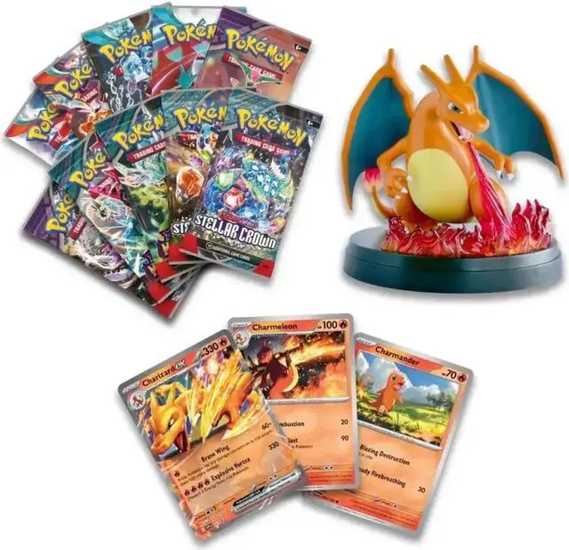 Charizard Guards Your Favorite Card! With explosive attacks and huge HP, Charizard ex has a commanding presence on the battlefield! Bring that burning tenacity to life on your desk, bookcase, or nightstand with an awesome Charizard figure featuring translucent fire effects to show off a favorite card-like the foil Charmander, Charmeleon, or Charizard ex you also get in this collection! Even more fun awaits in a stack of 10 booster packs from different Pokemon TCG expansions.
