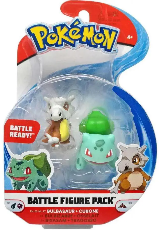 The Pokemon Battle Figures Bulbasaur Cubone set brings together two classic Pokemon in one compact figure pack. Each figure is designed with character inspired sculpting that highlights recognizable features and poses. The small scale size makes them easy to display on shelves or use during imaginative play. Sturdy construction supports long lasting enjoyment during repeated handling. This set fits seamlessly into Pokemon collections or themed play environments.