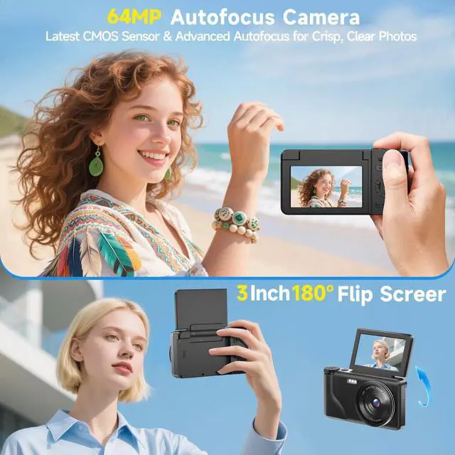 4K 64MP Digital Camera with 3" 180° Flip Screen, 2026 Latest Autofocus Vlogging Photography Camera for YouTube, 18X Digital Zoom Compact Travel Cameras with 64GB SD Card for Beginner (Black)