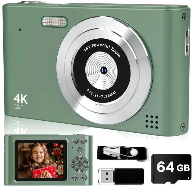 Digital Camera, 44MP Full HD 1080P Point and Shoot Camera with 64GB Card, Anti Shake 16X Zoom Compact Volg Cameras, Portable Small Camara Gift for Kids, Ages Teen Girl Boy - Green