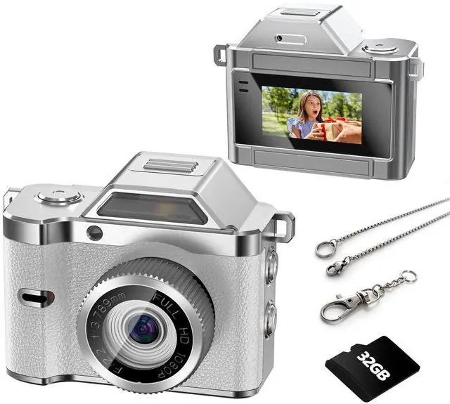 Mini Keychain Camera, 1080P Pocket-Size Camera with 32GB Card, Portable Mini Retro Camera, One-Button Recording, Lightweight Vintage for Travel, Birthday Gift, Party, Daily Moments(White)