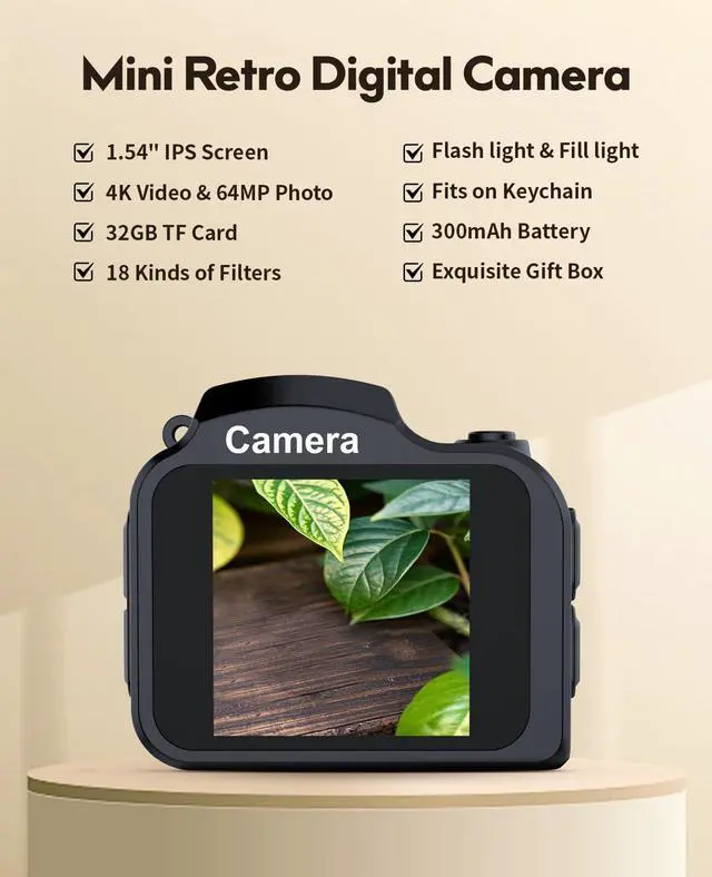 • All-in-One Mini CameraThis pocket-sized camera does it all: take photos, record HD videos, review your shots on the built-in screen, and add fun filters. With a simple flash for extra lighting, its easy to capture playful moments anytime. Whether youre looking for a small camera for travel or a cute camera for daily adventures, this tiny camera fits perfectly.