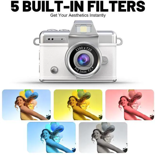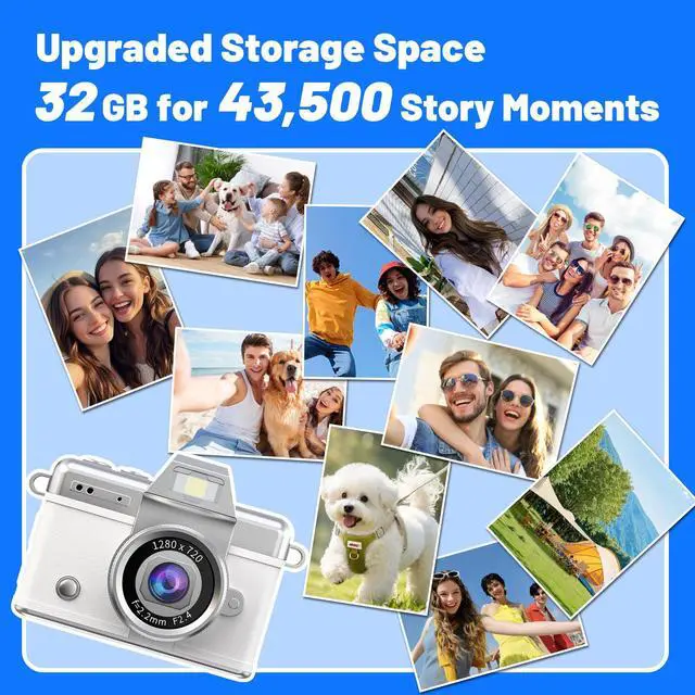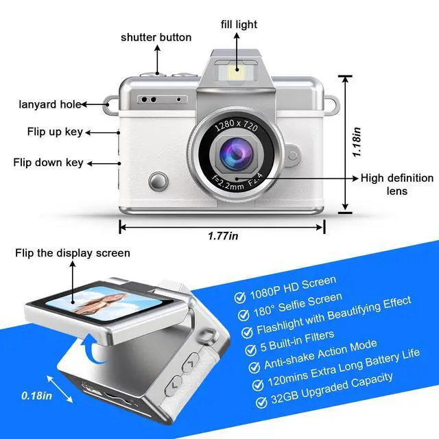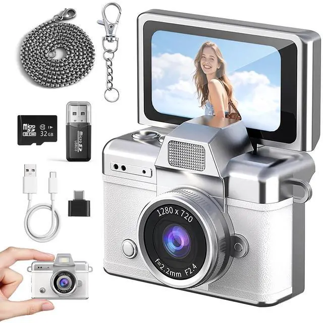 ALL-IN-ONE MINI CAMERA: This pocket-sized camera does it all: take photos, record HD videos, review your shots on the built-in screen, and add fun filters. With a simple flash for extra lighting, its easy to capture playful moments anytime. Whether youre looking for a small camera for travel or a cute camera for daily adventures, this tiny camera fits perfectly. ANTI-LOST DESIGN: The retro camera comes with a keychain and lanyard, which can be hung on your wrist or keys to prevent losing it, and can also be used to capture moments on the go, and hang it on your bag as a personalised accessory. 32GB STORAGE & EXPANDABLE MEMORY: With a pre-installed 32GB memory card, the mini keychain camera offers plenty of space for storing your precious moments. Perfect for long trips or events where you dont want to miss a moment! PERFECT FO BEGINNERS: With easy one-button controls and a lightweight design, this keychain camera is perfect for Beginners to explore photography. An ideal camera for beginners, teens, or anyone wanting a fun hiking camera or camera for travel to capture memories on the go. A SPECIAL GIFT TO REMEMBER: A unique surprise for birthdays, holidays, or just because. Perfect for teens, and photography lovers who adore retro cameras and vintage camera style. Make every memory extra special.