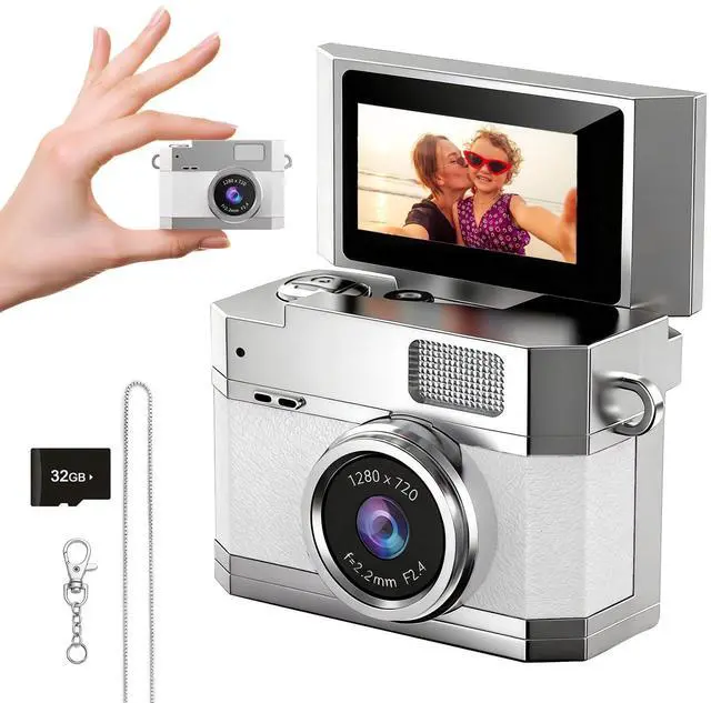 Mini Keychain Digital Camera White - HD Mini Digital Camera with 0.96" Flip Screen & 32GB Card, Portable Wearable Keychain Camera for Bag, World Cup Match Recorder, Fan Souvenir Camera