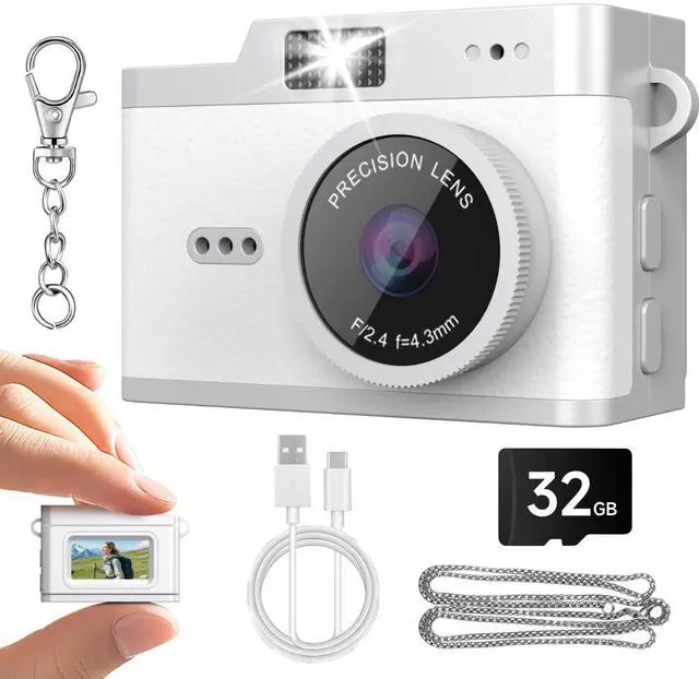 Mini Keychain Camera, Retro Snap Mini Digital Camera, 1080P Tiny Pocket Video Camera Vintage Portable Small Camcorder for Travel Vlogging, Video Recorder with 32GB Card, White