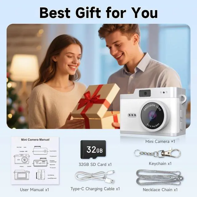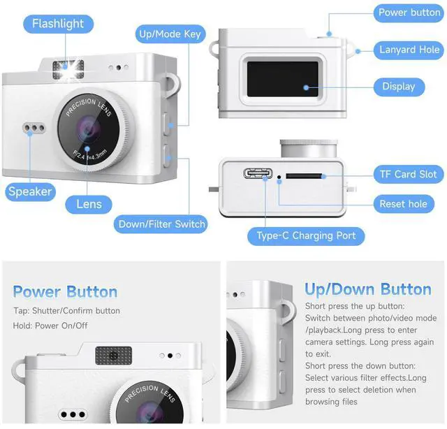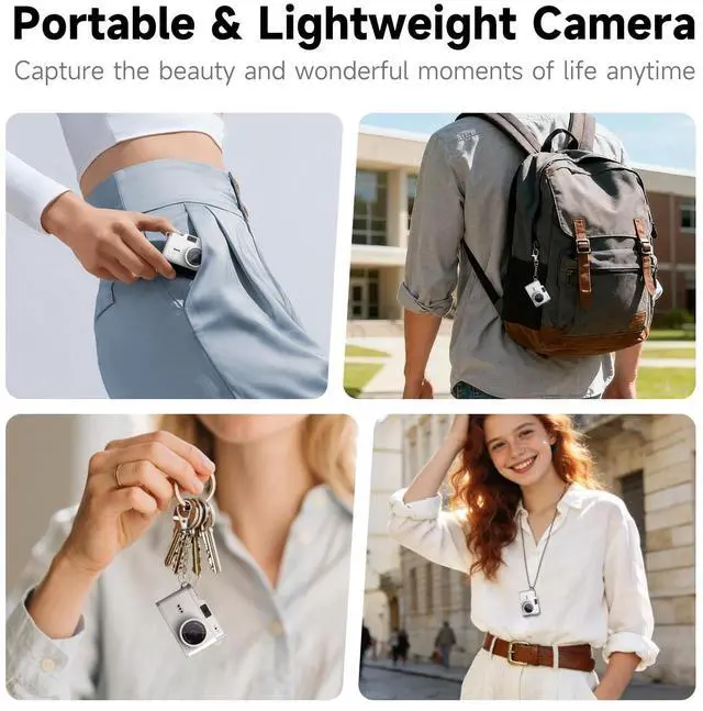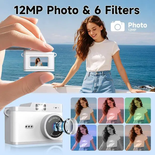 12MP & 1080P Photo Video CameraThe mini digital camera captures high-clarity FHD 1080P videos and 12MP photos with the newest CMOS metering syste. No complex manual settings required. Choose from 6 filters to take personalized photos. One second to press the shutter, it's easy for starters and kids.