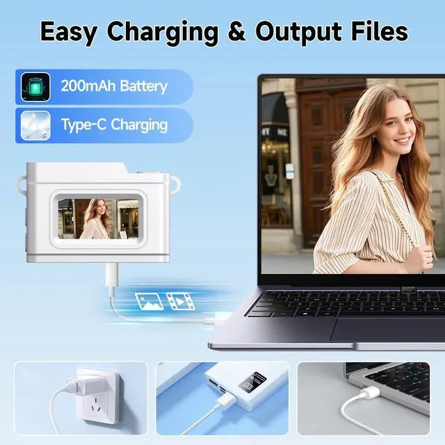 200 mAh Rechargeable Battery & Easy TransferThe pocket mini tiny camera features a built-in 180mAh rechargeable battery, which is charged using various power sources such as a 5V/1A charger, power bank, laptop, or car charger. keychain mini camcorder comes with 32GB TF card(Inserted into the mini camera) to store thousands of photos. The included Type-C cable allows for quick and easy transfer of photos and videos.