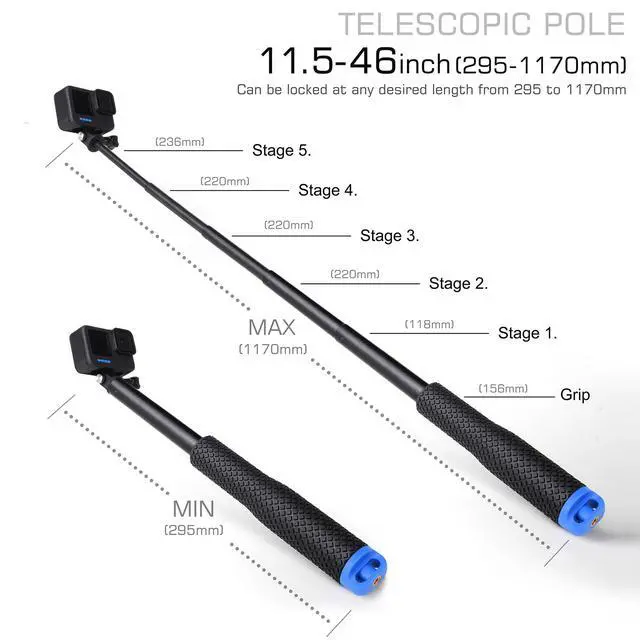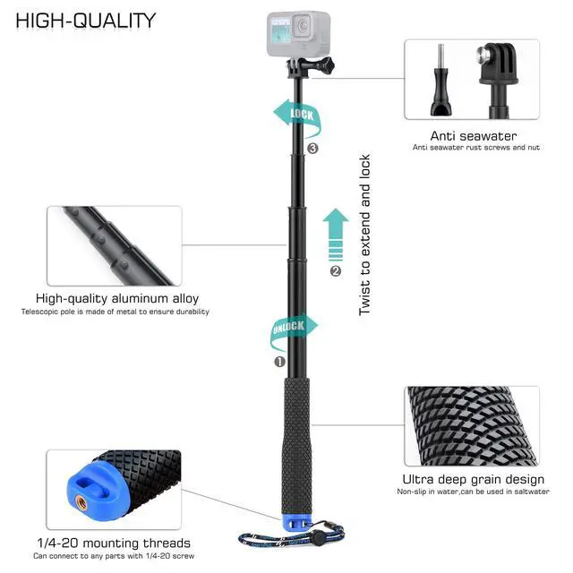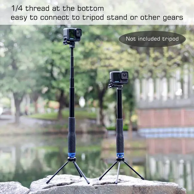 CD texture and 316 stainless steel, mini size(?F:0.9'') that you will not capture the pole during shooting, has effect of invisible selfie stick. Twist clockwise to unlock the tube, twist anti-clockwise to lock.