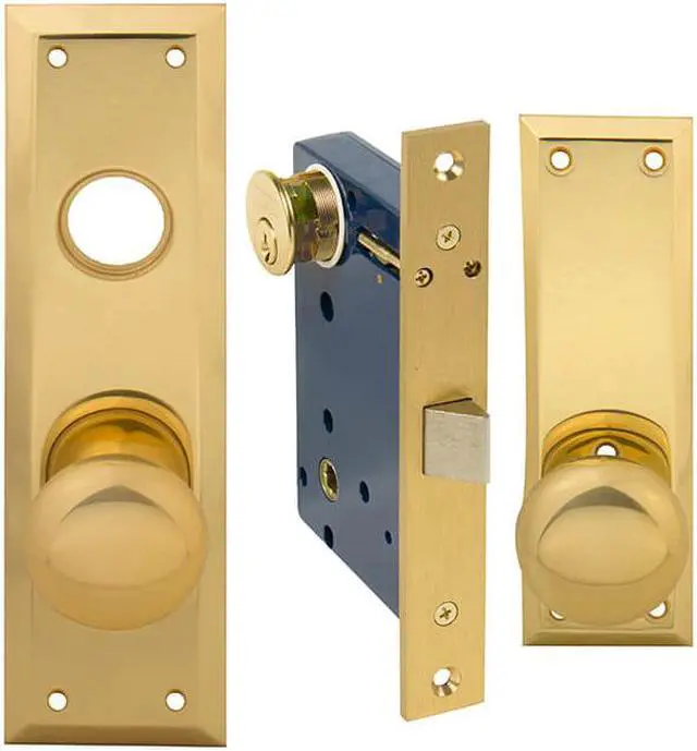 Em-D-Kay (Marks 91DW/3 Like) 5100DWL Polished Brass Left Hand Heavy Duty Vestibule Function Always Locked Storeroom Lockset, Surface Mounted Mortise Lock Set Screw on Knobs with Swivel Spindle. 2-1/2" Backset, Latch Only (No Bolt and Rocker), Front face plate:1-1/16" x 7-5/8". Cylinder on outside and