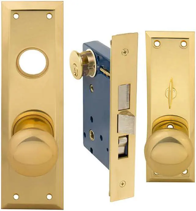 Em-D-Kay (Like Marks 91A/3-X) 5100XL, Polished Brass, Left Hand, Wide Face Plate, Heavy Duty Mortise Entry Lockset Surface Mounted Screw-on Knobs Lock Set. 2-1/2" Backset, Deadbolt: 1", Wide