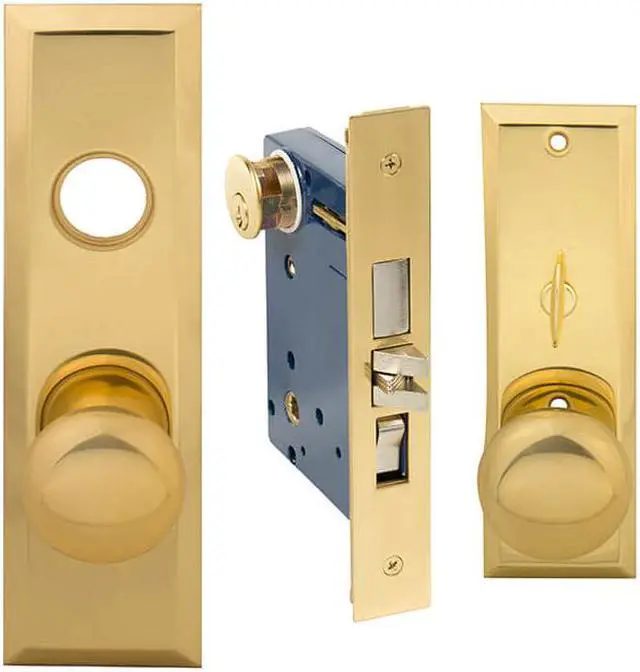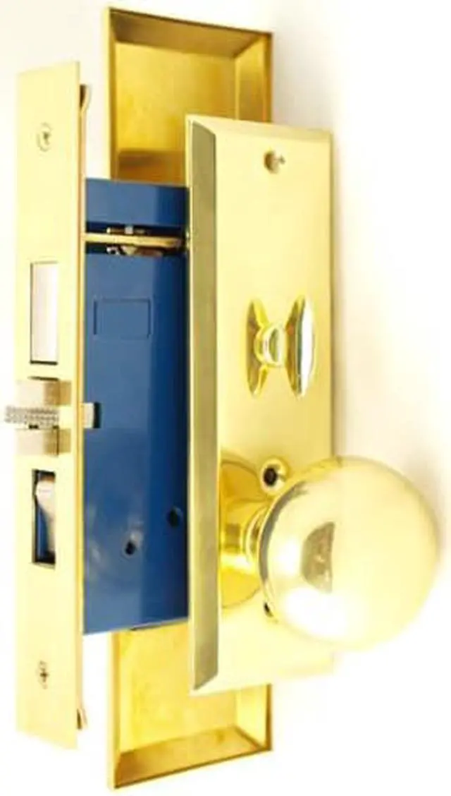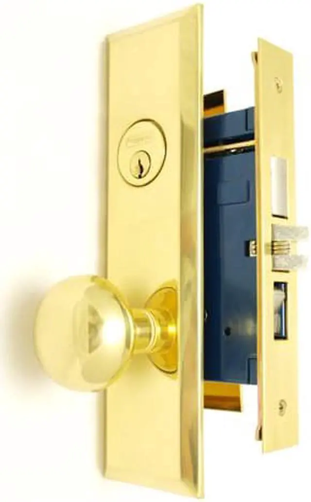Em-D-Kay (Like Marks New Yorker 7NY10A/3) 5700AL Polished Brass US3 Left Hand Heavy Duty Mortise Entry Entrance Lockset Through-Bolted Screwless Knobs (Not Surface Mounted). 2-3/4" Backset, Deadbolt: 1", Latch: Scissor Latch and Anti Friction Latch, Wide Front Face Plate: 1-1/4" x 8". Cylinder on outside and thumb turn on inside. Commercial Mortise Locksets. Apartment function with Bolt, Latch & Rocker.