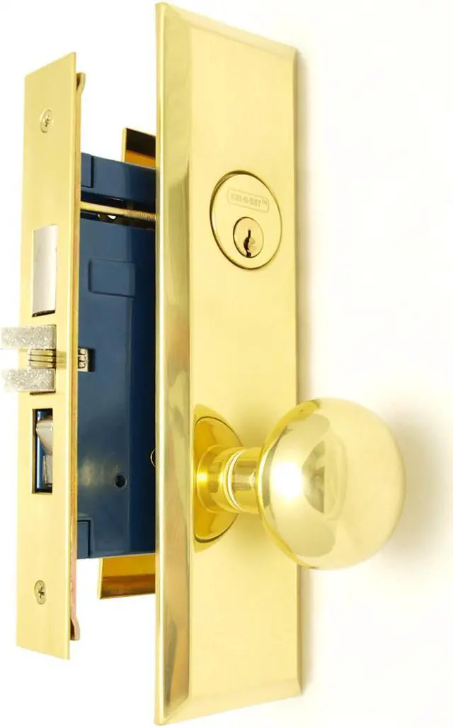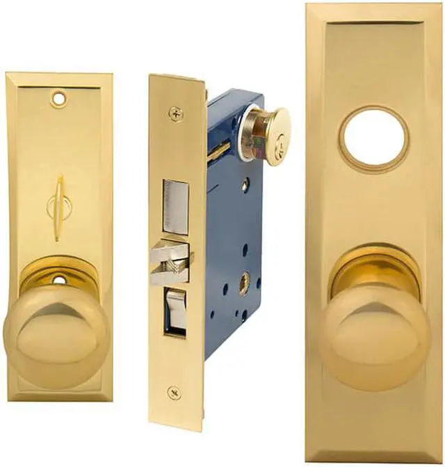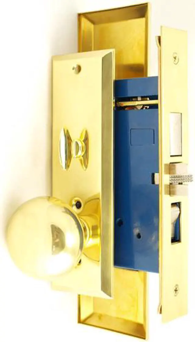 Em-D-Kay (Like Marks New Yorker 7NY10A/3) 5700AR Polished Brass US3 Right Hand Heavy Duty Mortise Entry Entrance Lockset Through-Bolted Screwless Knobs (Not Surface Mounted). 2-3/4" Backset, Deadbolt: 1", Latch: Scissor Latch and Anti Friction Latch, Wide Front Face Plate: 1-1/4" x 8". Cylinder on outside and thumb turn on inside. Commercial Mortise Locksets. Apartment function with Bolt, Latch & Rocker.