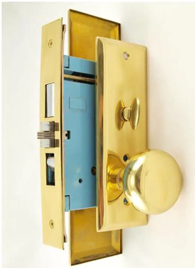 Maxtech (Like Marks New Yorker 7NY10A/3) 1033BFL Polished Brass Left Hand Heavy Duty Mortise Entry Lockset. 2-3/4" Backset, Deadbolt:1", Latch: Scissor Latch and Anti Friction Latch, Front face plate:1-1/4" x 8". Cylinder on outside and thumb turn on inside. Commercial Mortise Locksets. Thru-Bolted Screwless Knobs.