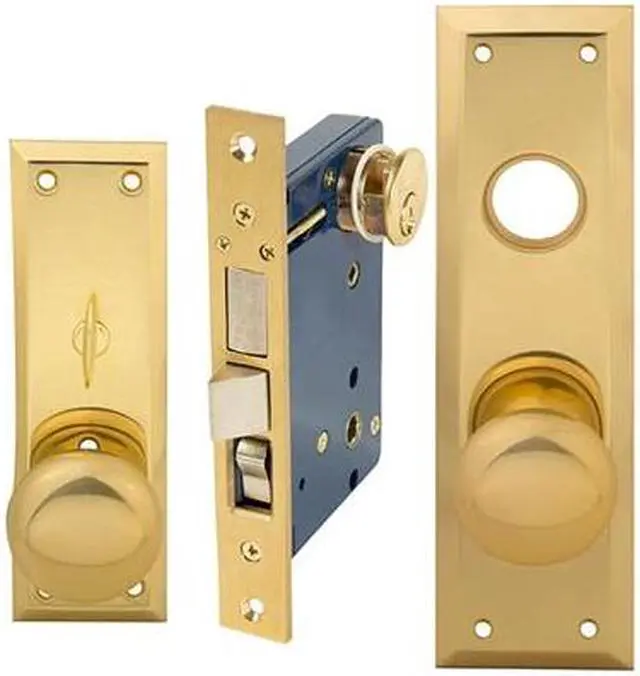 Maxtech (Like Marks 91A/3-X) 1033AXR, Polished Brass, Wide Face Plate, Right Hand, Heavy Duty Mortise Entry Lockset Surface Mounted Screw-on Knobs Lock Set. 2-1/2" Backset, Deadbolt:1", Wide Face Plate -> front: 1-1/4" x 8". Cylinder on outside and thumb turn on inside. Commercial Mortise Locksets.