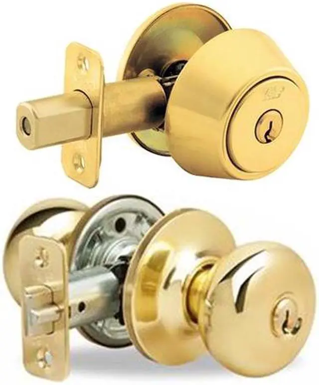 Yale 827-605 Polished Brass US3 Heavy Duty New Tradition Entry Combo Cingle Cylnder Deadbolt And Knobset, designed with guarded latchbolt operated from outside by key, inside by knob and "T" turn. The turn button locks the outside knob, and the "T" turn locks the outside deadbolt. The outside knob and deadbolt unlock by key or by turning inside turn button and "T" turn. This combo set has concealed holding screws providing an afordable, durable, and stylish design that's timeless. This combo set is A156.2 Series 4000 ANSI/BHMA Grade 3 certified, and they feature 2-1/8" face bores, 1" edge bores, 2-3/8" backsets, and solid brass 5 pin cylinder with Kwikset KW1 keyway. These locks fit doors 1-3/8" to 1-3/4" inches thick, and they have latch faces of 1" by 2-1/4" inches.