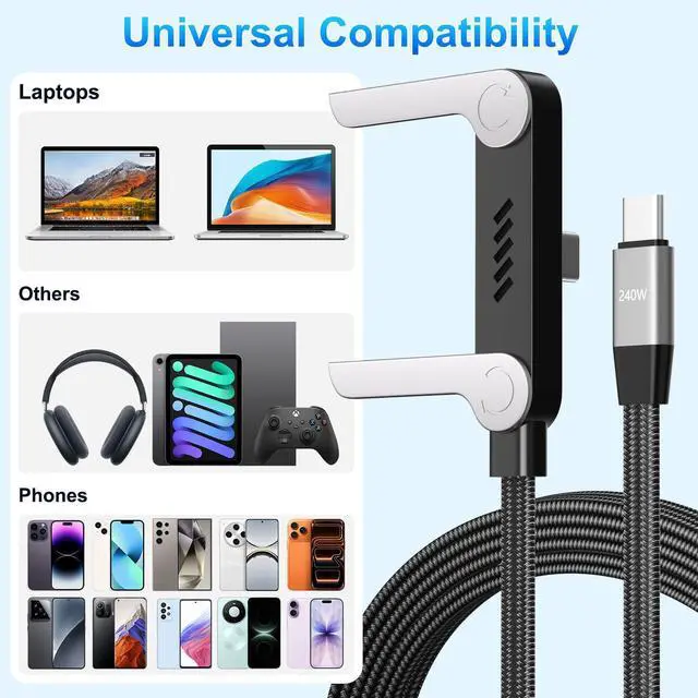 240W Braided Fast Charge Cable, 2026 New Invisible Holder Charger Cable with Stand, 4.92 ft Foldable Durable 240W Stand Data Cable USB-C Cord 90 Degree Right Angle USB C Cable, Type C to Type C (1)