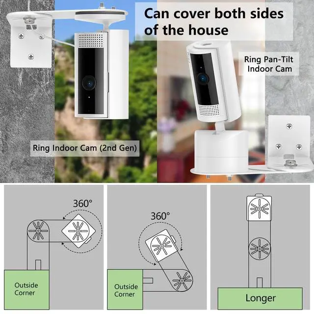 After having this corner wall mount bracket, you can have a view of both sides of the house with one Ring Pan-Tilt Indoor Cam mounted in the corner. With just 2 Ring Pan-Tilt Indoor Cam you can cover a 360 degree view of the house.