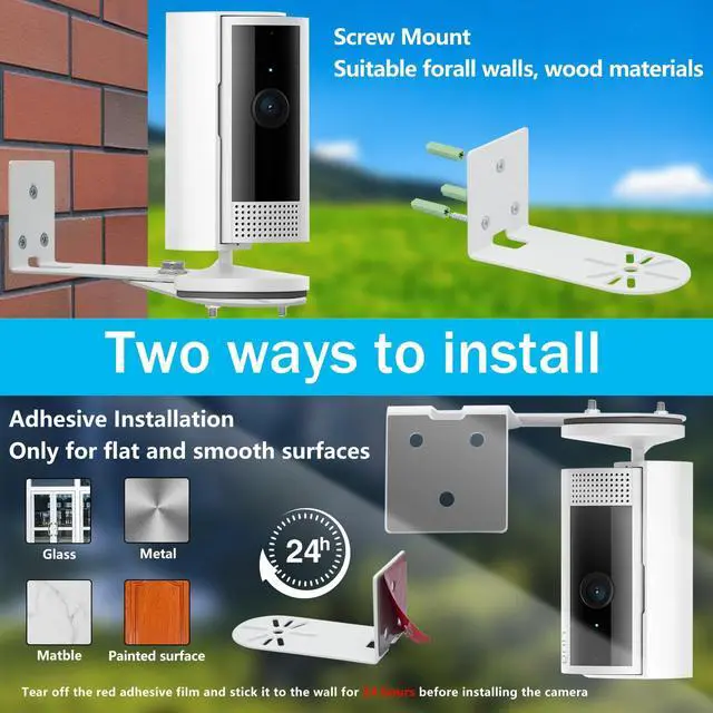 This is a specially designed bracket for Ring Pan-Tilt Indoor Cam, easyto install, can be mounted indoor or outdoor, swivel arm removable or extendable, two mounting methods are provided: 3M adhesive mounting or screw mounting.