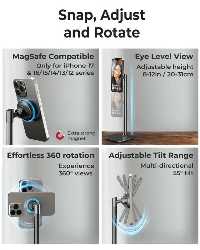 | Face level MagSafe phone stand | Face level phone holder | Ventilated tablet stand | Face level holder + ring light | Low-profile rotating stand | Low-profile rotating stand | Extra tall & strong stand |