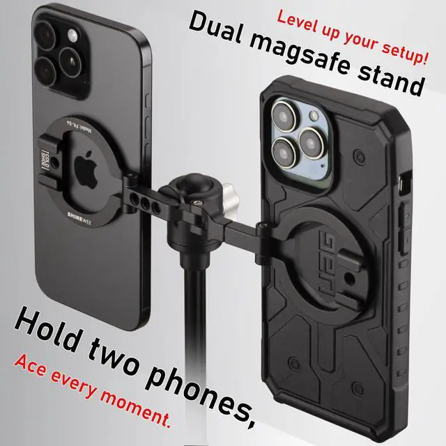This holder features dual MagSafe magnetic rings on both ends, allowing easy attachment of two MagSafe-enabled phones. The magnetic rings support foldable and flip adjustment for flexible angles. Each ring’s back is equipped with a cold shoe mount (ideal for adding fill lights or microphones), while the connecting rod has a standard 1/4"-20 threaded hole—compatible with tripods, desktop stands, and other supports. Perfect for dual-phone scenarios like live streaming, multi-screen operation, or hands-free viewing.