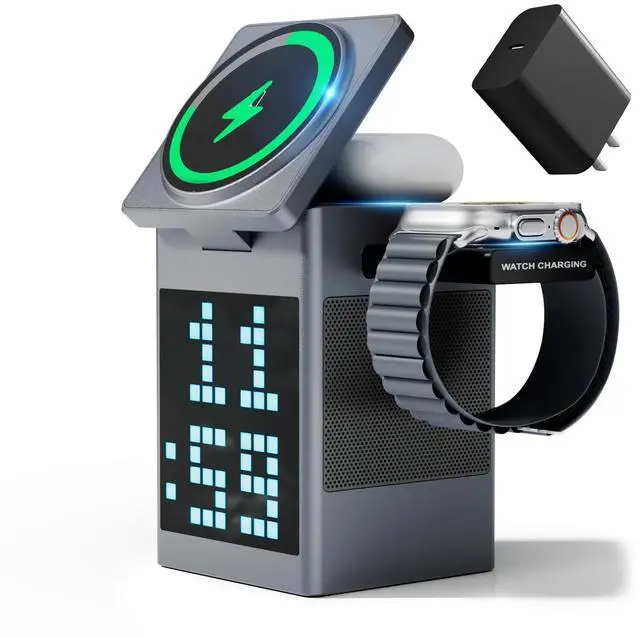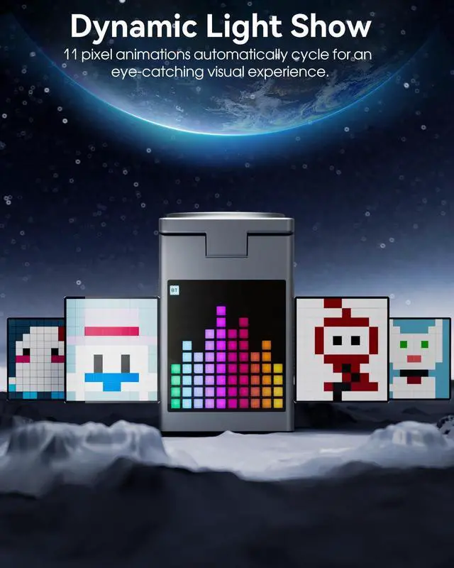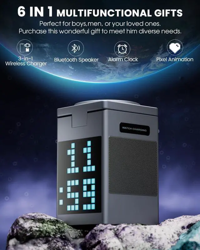 Compact yet powerful! Vivilumens 6-in-1 multifunctional wireless charger combines wireless charging, Bluetooth speaker, digital clock, and pixel display. Perfect for home or office, it adds convenience and joy to your daily life, keeping you energized every day!
