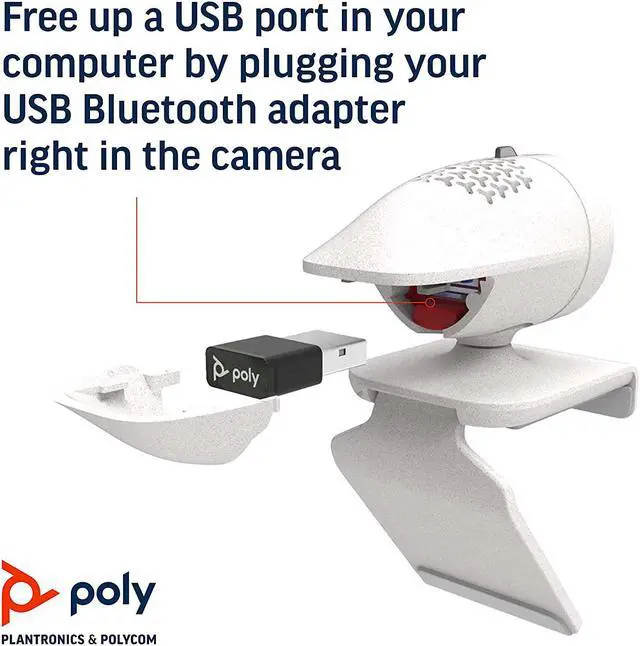 Streamline your setup by using a Poly headset or speakerphone connected wirelessly to the Poly Studio P5 webcam. Just pop open the rear garage door, park your USB-A wireless adapter and presto! Your audio and video are ready to go.