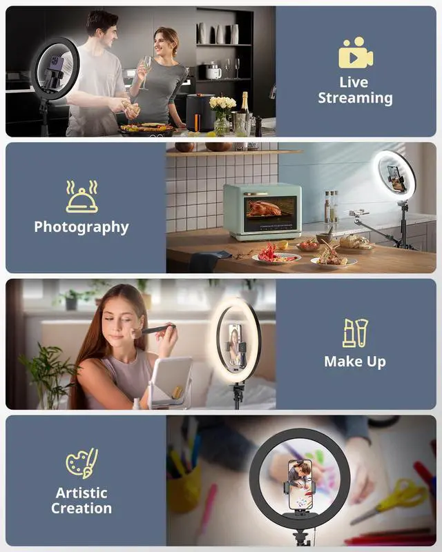 • Professional Photography Light: The 12" ring light offers 3 color modes and 10 brightness levels to match any environment. With CRI 95+, your colors stay true-to-life. The included diffuser softens harsh light, reduces glare, and minimizes shadowsideal for makeup, teaching, and livestreams