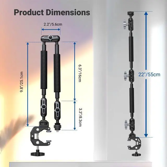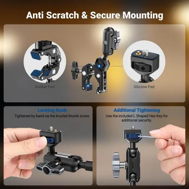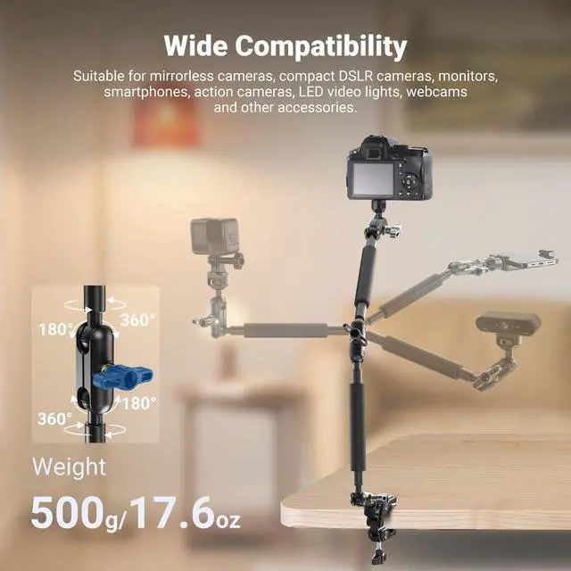 | Rod/Pole/Table/Monitor/DSLR | Rod/Pole/Table/Monitor/DSLR | Action Camera & Phone | Desk/selfie stick/light stand | Camera Cages | Compatible with PD, Arca Type |