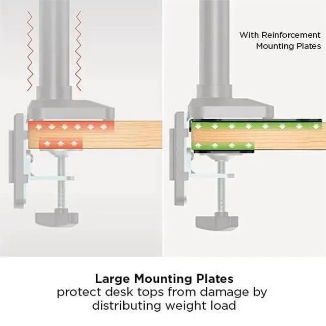 - Large Mounting Plates protect desk tops from damage by distributing weight load