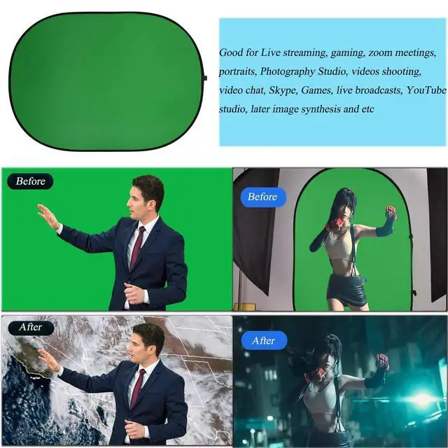 2-in-1 Green and Blue Screen BackdropDouble-sided collapsible reversible twist Green Screen & Blue Screen background backdrop( One side-green, Other side-blue). The YUOCU 5x7ft portable Chromakey green blue screen can be used for Live streaming, gaming, zoom meetings, portraits, Photography Studio, videos shooting, video chat, Skype, Games, live broadcasts, YouTube studio, later image synthesis and etc.
