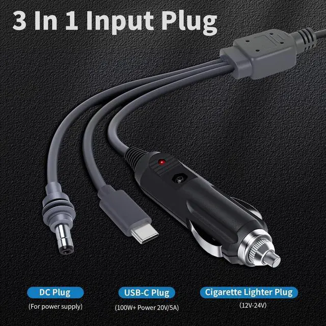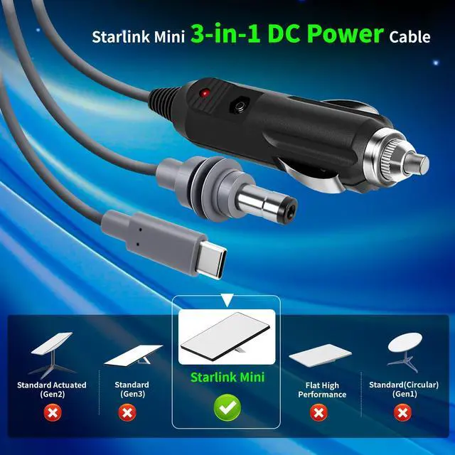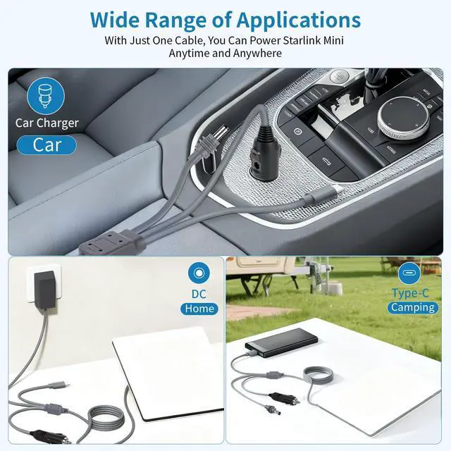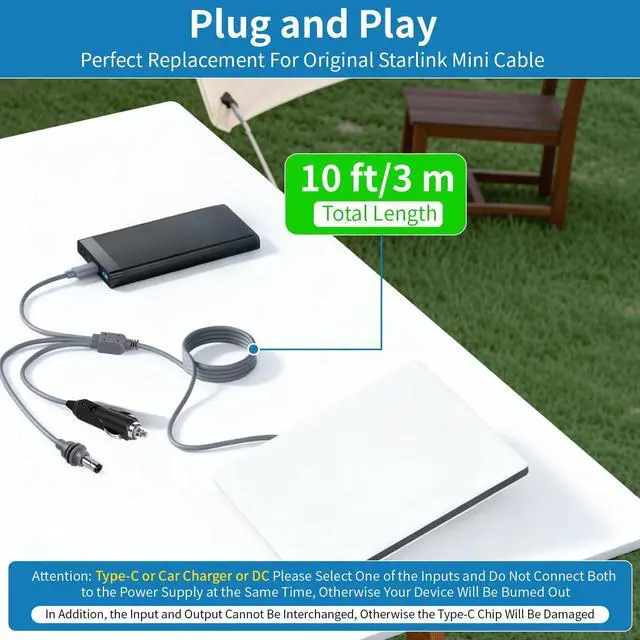 3-in-1 high-performance charging cable for Starlink Mini, Versatility and durability. This 10FT/3M cable combines USB-C PD 100W fast charging, 12V car adapter, and DC power input in one compact solution - perfect for RV trips, camping adventures, or mobile workstations.