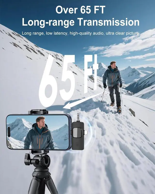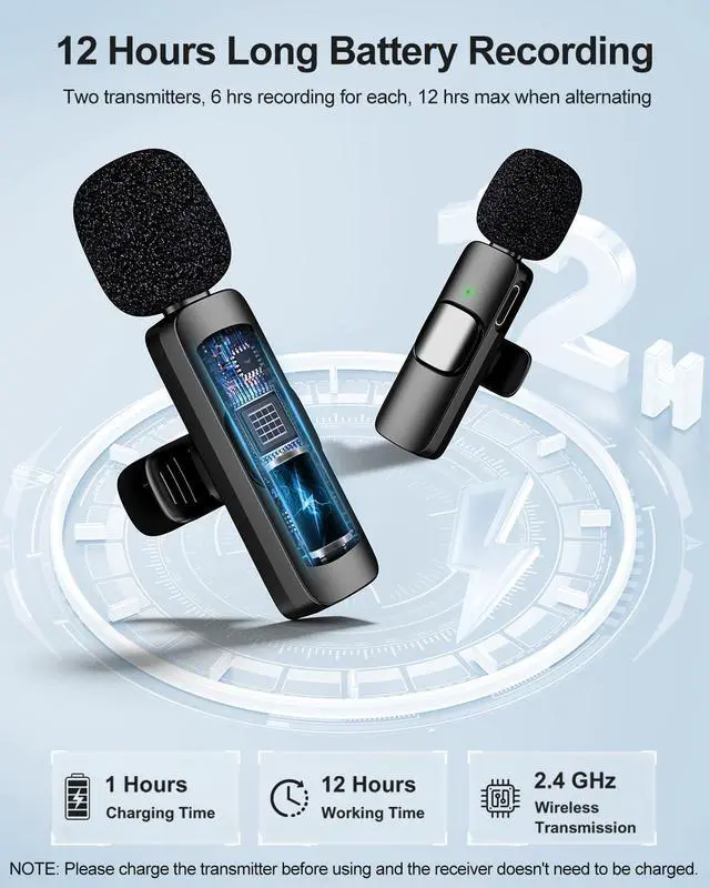 Long Battery Life & 65ft RangeClip this compact lapel mic to your collar and record for 12 hours solo or 6 hours dual-mic sessionsand you can charge your phone while recording via the receivers passthrough port. No more battery anxiety during shoots!The 66ft range allows for unrestricted movement without losing connection, enabling capture of every detail with studio-quality audio.'
