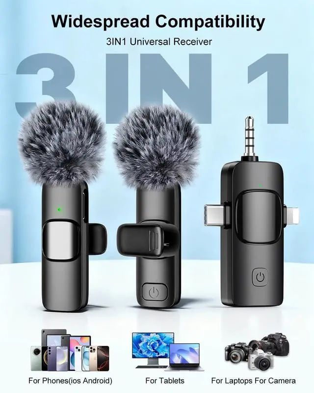 3 in 1 Professional Wireless Lavalier Microphone for iPhone, Android, Camera,Mini Microphone, Lapel Mic with Noise Reduction, Crystal Clear Sound for Recording, YouTube, Podcast, Vlogging