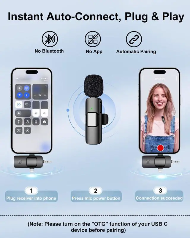 Automatic PairingWireless microphones use the latest 2.4GHz wireless technology for ultra-low latency. No additional software or bluetooth pairing is required.Just plug the receiver into your device and long press the power button of the transmitter, lapel microphone automatically connects.This feature saves you time and ensures hassle-free operation, making it perfect for users who need to start recording immediately.