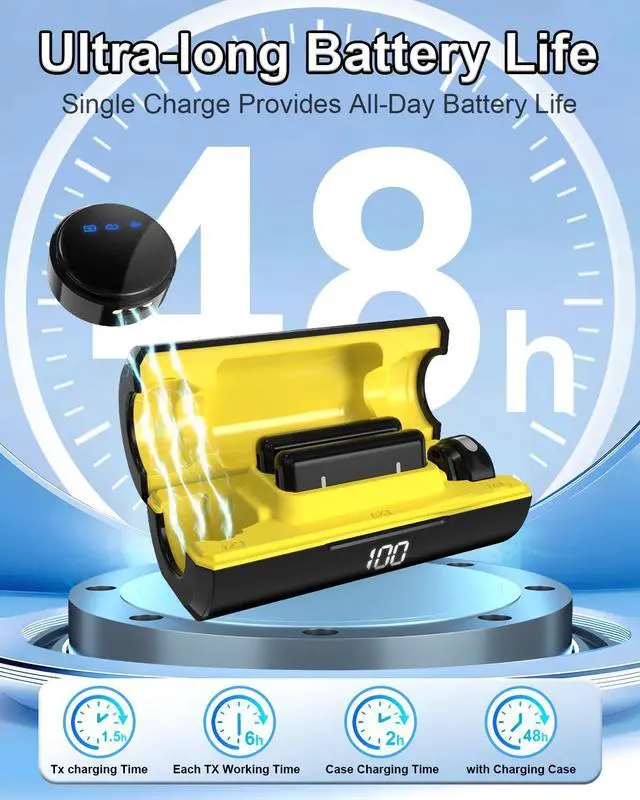 Never run out of battery! The included charging case can be fully charged in 2 hours, can recharge for one microphone 8 times. One microphone can be continuously used for 6 hours, it can work for 48 hours with charging case. So you can record all day without interruption.