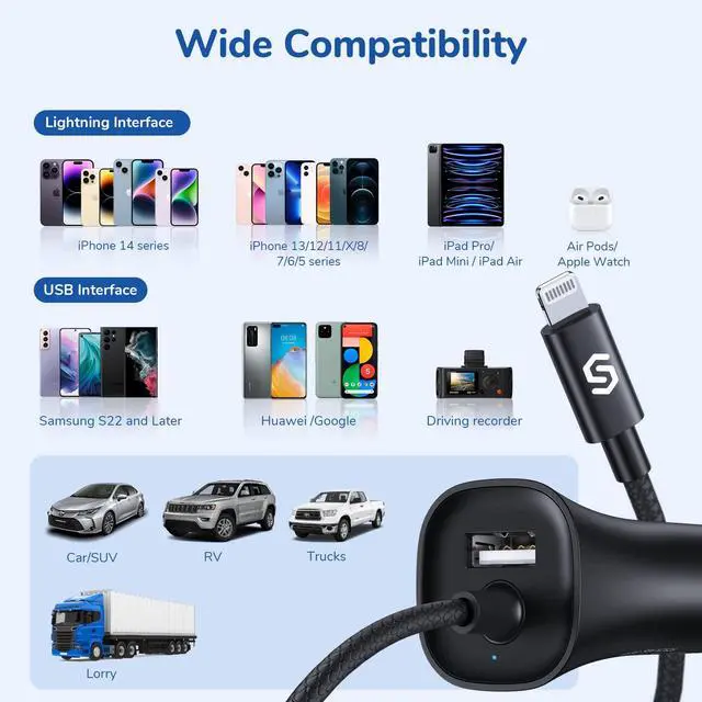![Alt view image 6 of 7 - [Apple MFi Certified] Syncwire iPhone Car Charger 32W Super Fast Car Phone Charger Cigarette Lighter USB Car Adapter with Build-in 5FT Coiled Lightning Cable for Apple iPhone 14/13/12/11/XR/Max, iPad](https://c1.neweggimages.com/productimage/nb640/C5JMD2603050BHNZQDD.jpg)