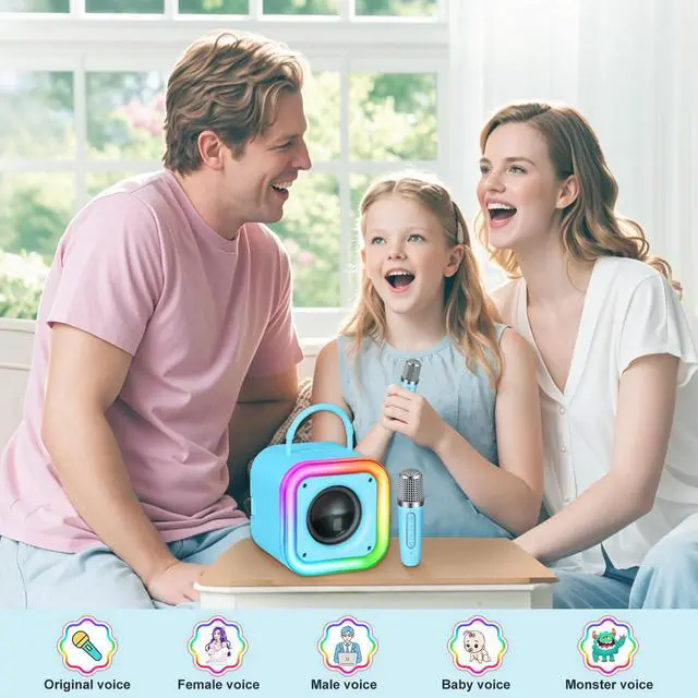 • [5 Fun Variable Sounds and LED Lights] - Kids karaoke machine with 2 microphones, long-lasting battery life, sing to your heart's content, but also has different sound options: girls, boys, babies, monsters and acoustic sounds, 5 magical sounds to add fun, LED lights synchronized with the music to create a lively party atmosphere