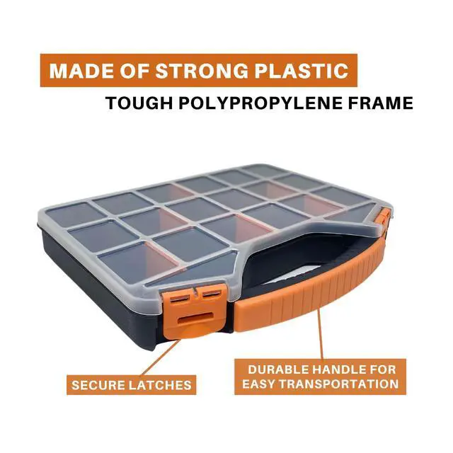 Multi-Section Tool Storage Box – Featuring 18 individual compartments this hardware box can be used for nuts, bolts, screws, fishing tackle, arts and crafts, small mechanical parts, DIY hobby goods, and more.