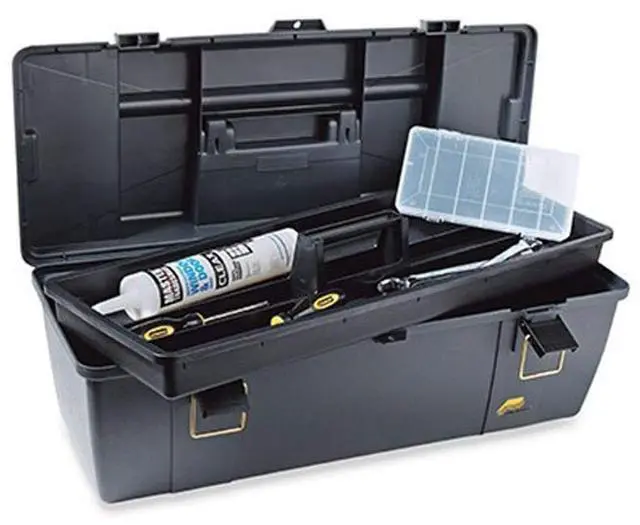 New 26-Inch tool box with bulk storage space and lift out tray. Lid holds two clear plastic removable organizers for small parts. This tool box is made from durable plastic and measures 26-Inch L by 11-Inch W by 9.88-Inch H
