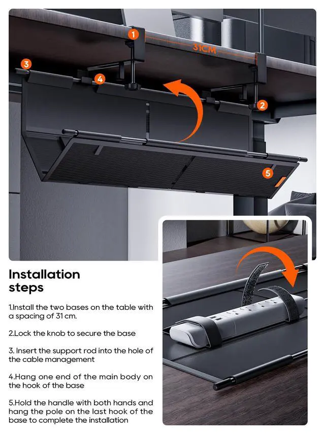 NO DRILLFix the under desk cable tray with the clamp-clip and tighten it, 3s to complete. The important thing is that it doesn't damage your desk
