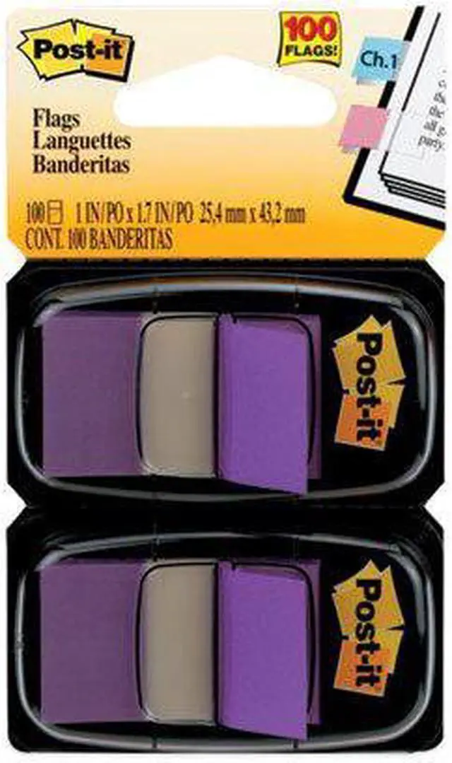 Find it fast with Post-it Flags in bright eye-catching colors that get noticed. They make it simple to mark or highlight important information in textbooks, calendars, notebooks, planners and more. They stick securely, remove cleanly and come in a wide variety of colors. Draw attention to critical items or use them to index, file or color code your work, either at home, work or in the classroom. Try with Post-it Notes for the ultimate study duo. Two-Pack. Color(s): Purple; Color Family: Purple; Dispenser: Pop-Up; Size: 1 x 1.75.