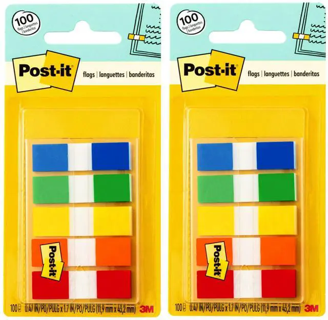 Find it fast with Post-it Flags. They make it simple to mark, flag or highlight important information. They stick securely, remove cleanly and come in a wide variety of colors. Draw attention to critical items or use them to index, file or color code your work, either at home, work or in the classroom. Pair with Post-it Notes for the ultimate study duo. Contains Red, Bright Orange, Yellow, Green and Blue, .47 in. Wide., 2 Dispensers 100 flags per Dispenser