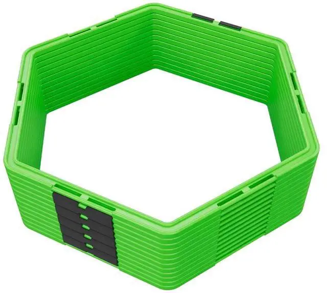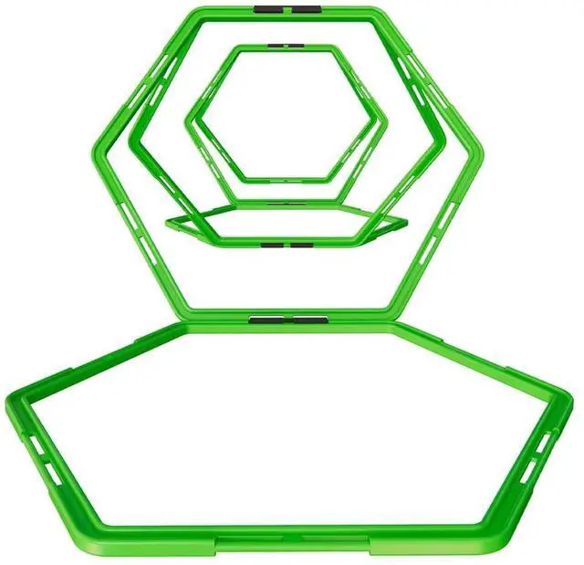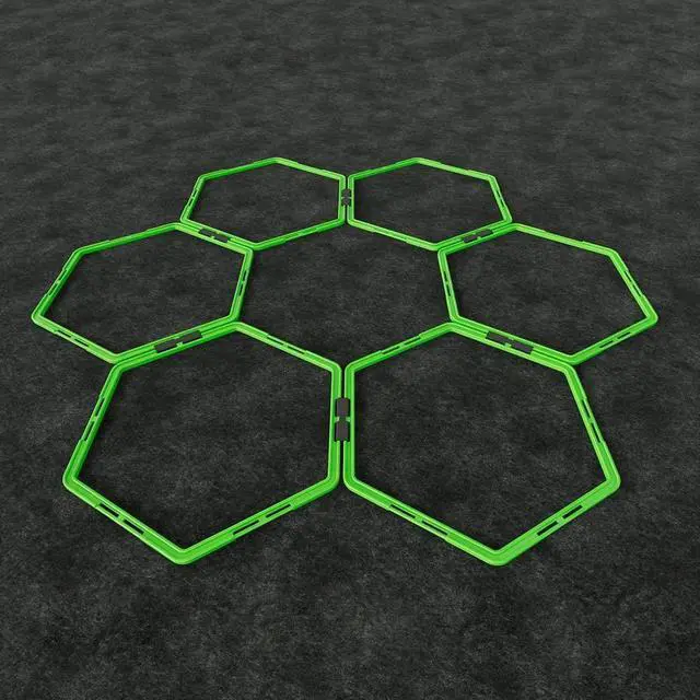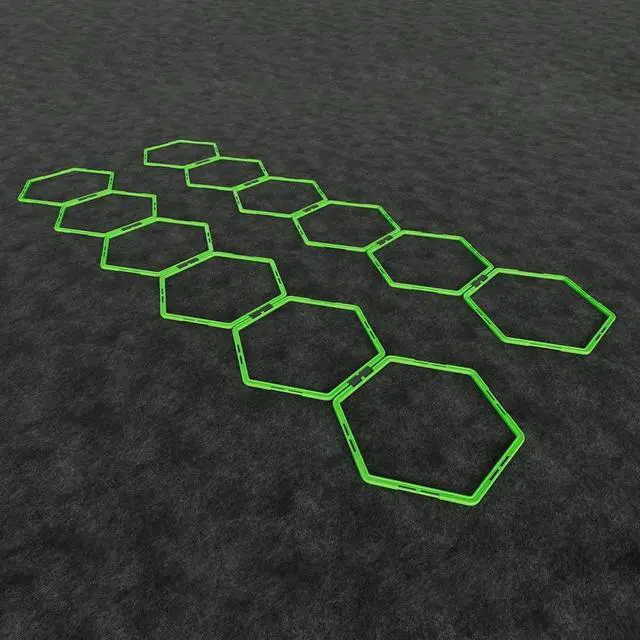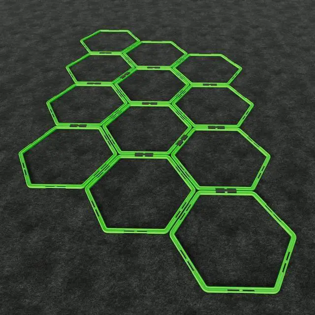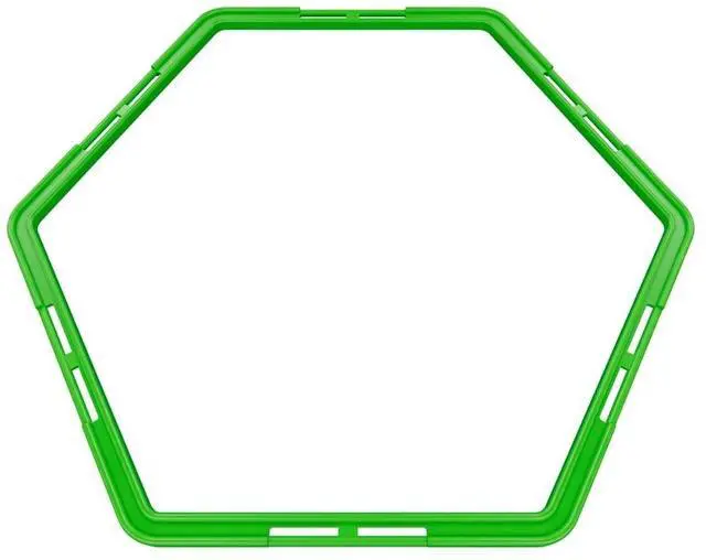 Build a flat agility ladder, complex hurdles, or any combination for speed or skill drills. Position these 19" diameter hex rings in custom training patterns to develop foot speed, agility, overall coordination, and mental focus. Attach the PVC clips to maintain ring position during drills. Lightweight design for convenient transport. Set includes twelve 1/4" thick rings, twelve PVC clips, and a carry bag. Good for indoor and outdoor training. Features: High-impact PVC Use indoors or outdoors Set includes a dozen hex rings, clips and a carry bag Lime Green