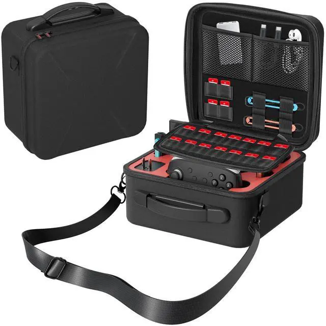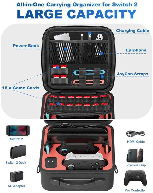 All-in-One Storage MasterNever compromise on what to bring. This is the ultimate Switch 2/1/Oled all in one case and Switch 2/1/Oled accessories case in one. Securely organize your complete setup: Switch 2/1/Oled, Dock, Pro Controller, joycon Grip, AC Adapter, HDMI cable, straps, power bank, headphones, cables, and 18 game cards - everything protected in this Switch 2 all in one carrying case!