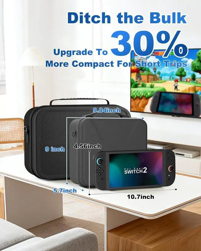 The Space-Saving Marvel for Gamer on the GoEngineered with precision, this compact Switch 2/1/Oled carrying case defies the bulky norm. Measuring just 9.84"L x 5.7"W x 9"H, its efficient square design is the ultimate Switch 2 travel case that stores more in less space. It delivers maximum Switch 2/1/Oled accessories storage with a minimum footprint, making it the most portable Switch 2/1/Oled hard shell case on the market.
